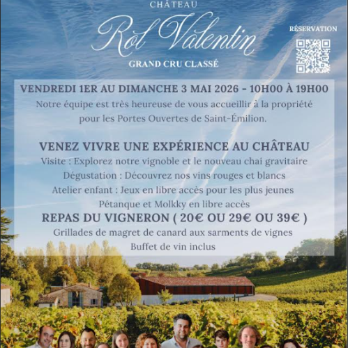 Du vendredi 1er mai au dimanche 3 mai de 10h à 19h, les équipes du Château Rol Valentin vous ouvre ses portes à l'occasion des Journées Portes Ouvertes de Saint-Émilion