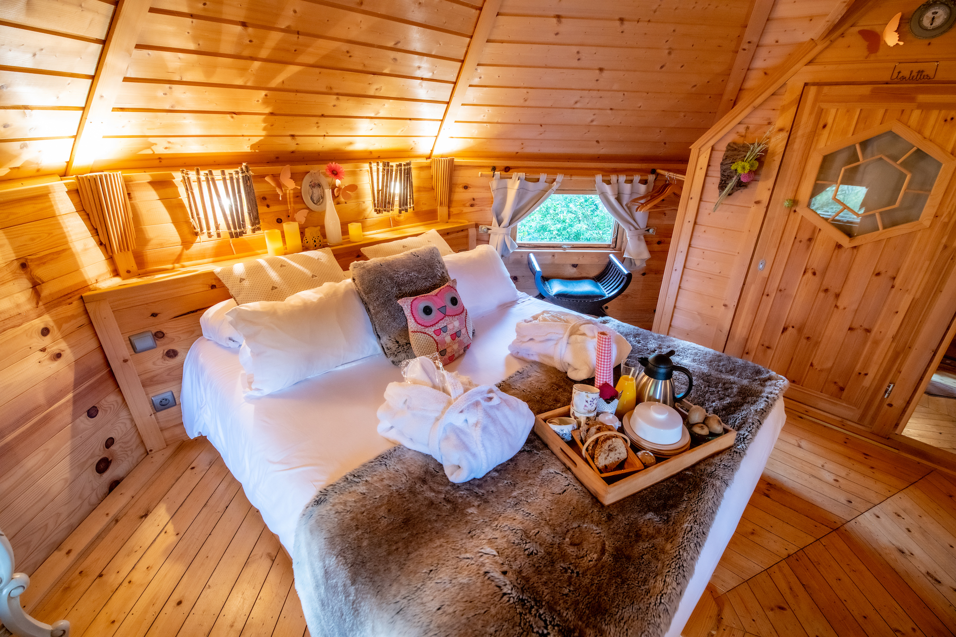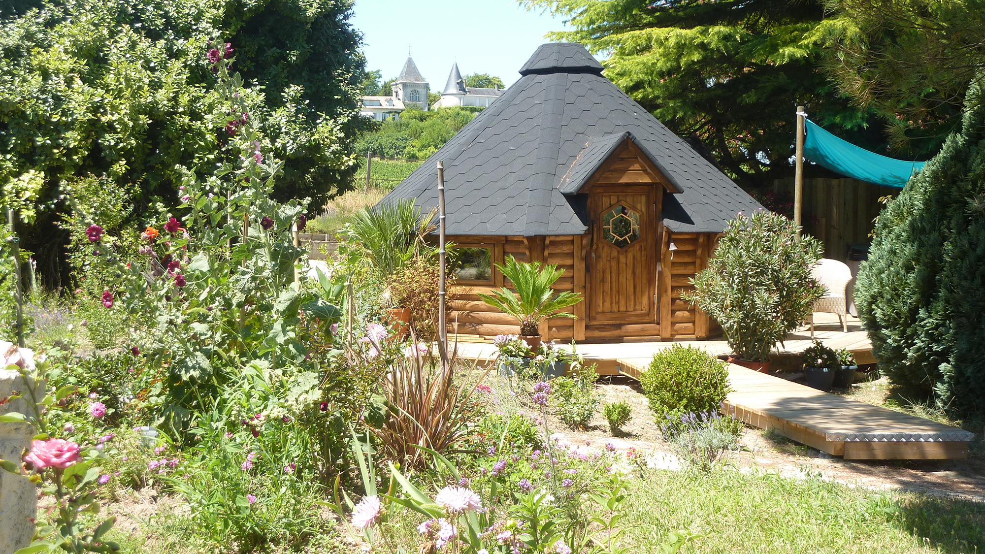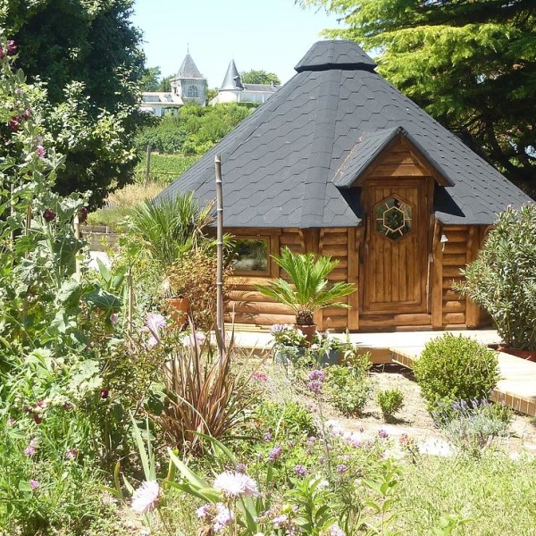 在葡萄园和枞树林之间,100% 木质木屋中的独立客房设施齐全,每间木屋的露台上都设有私人按摩浴缸(每晚价格为 169 欧元)。