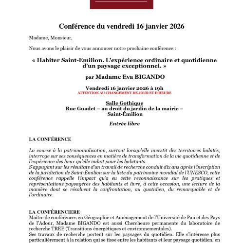 l’inscription de la juridiction de Saint-Émilion sur la liste du patrimoine mondial de l’UNESCO, cette conférence rappelle l’impact qu’a eu cette reconnaissance sur les pratiques et représentations paysagères des habitants, et livre, à cette occasion, une lecture de la manière dont se résout la confrontation, au quotidien, du remarquable et de l’ordinaire.