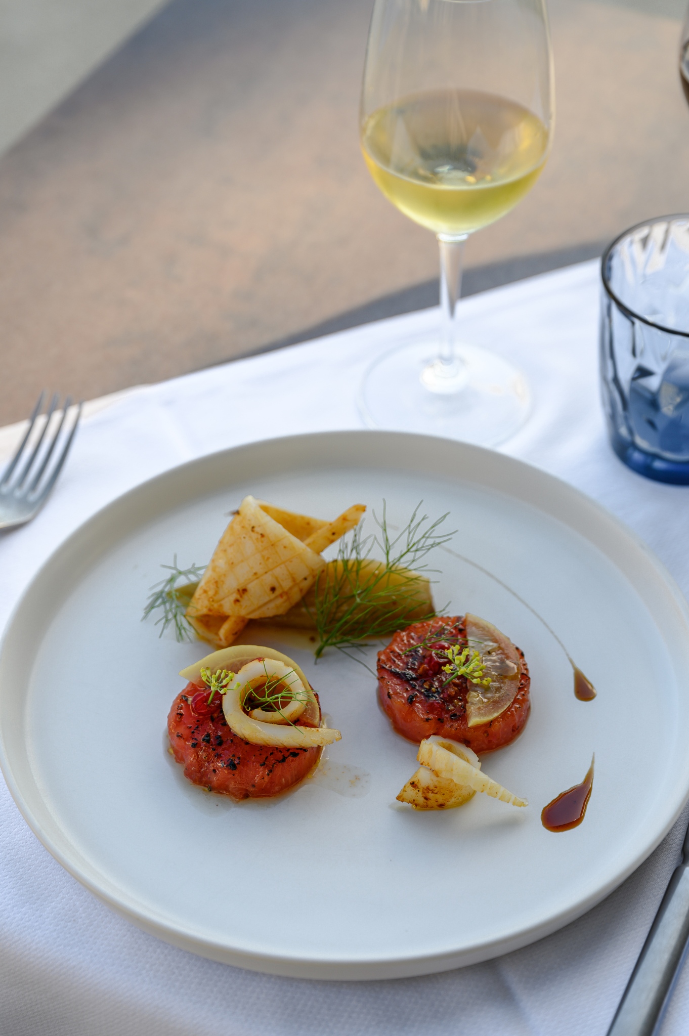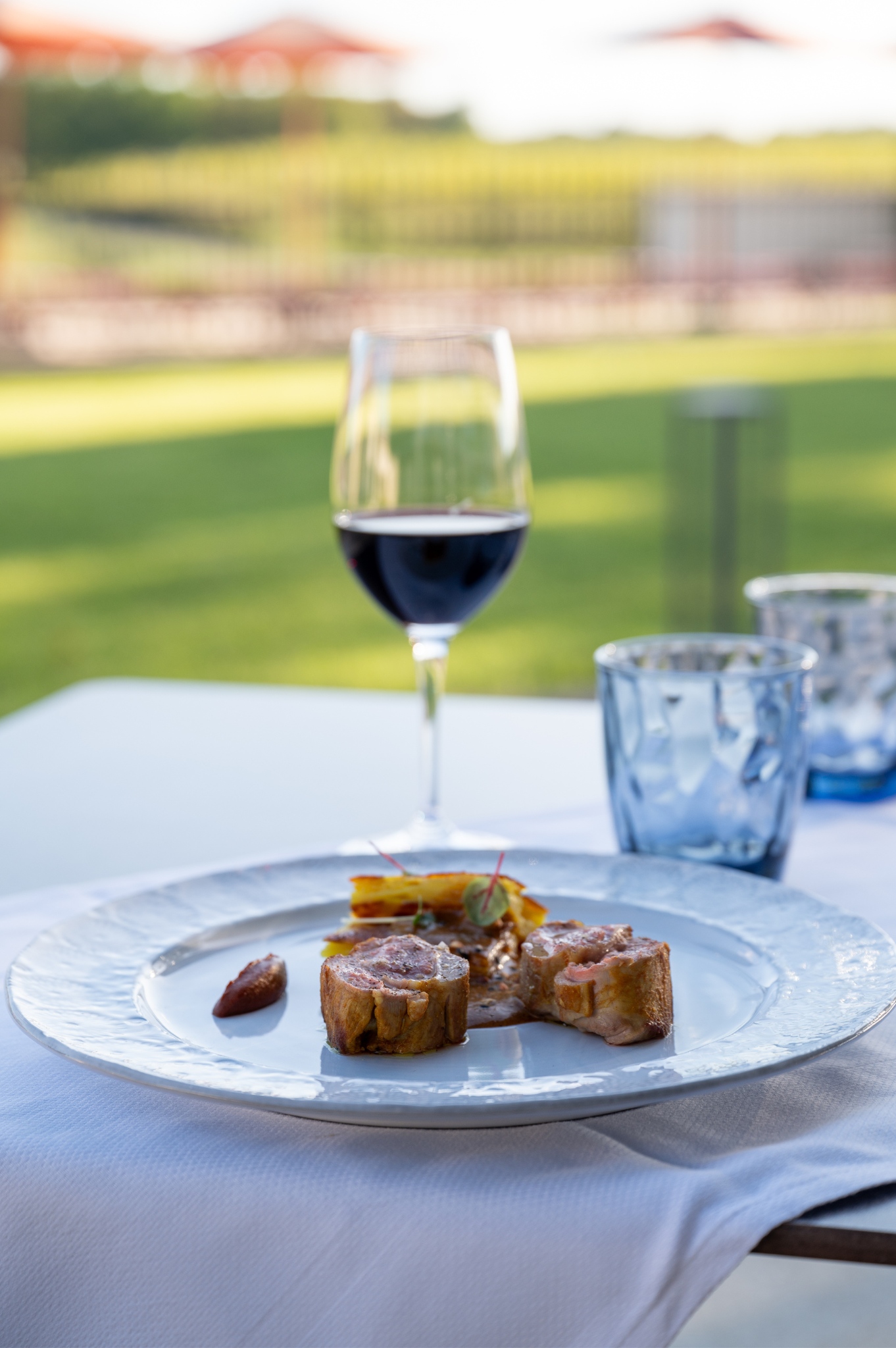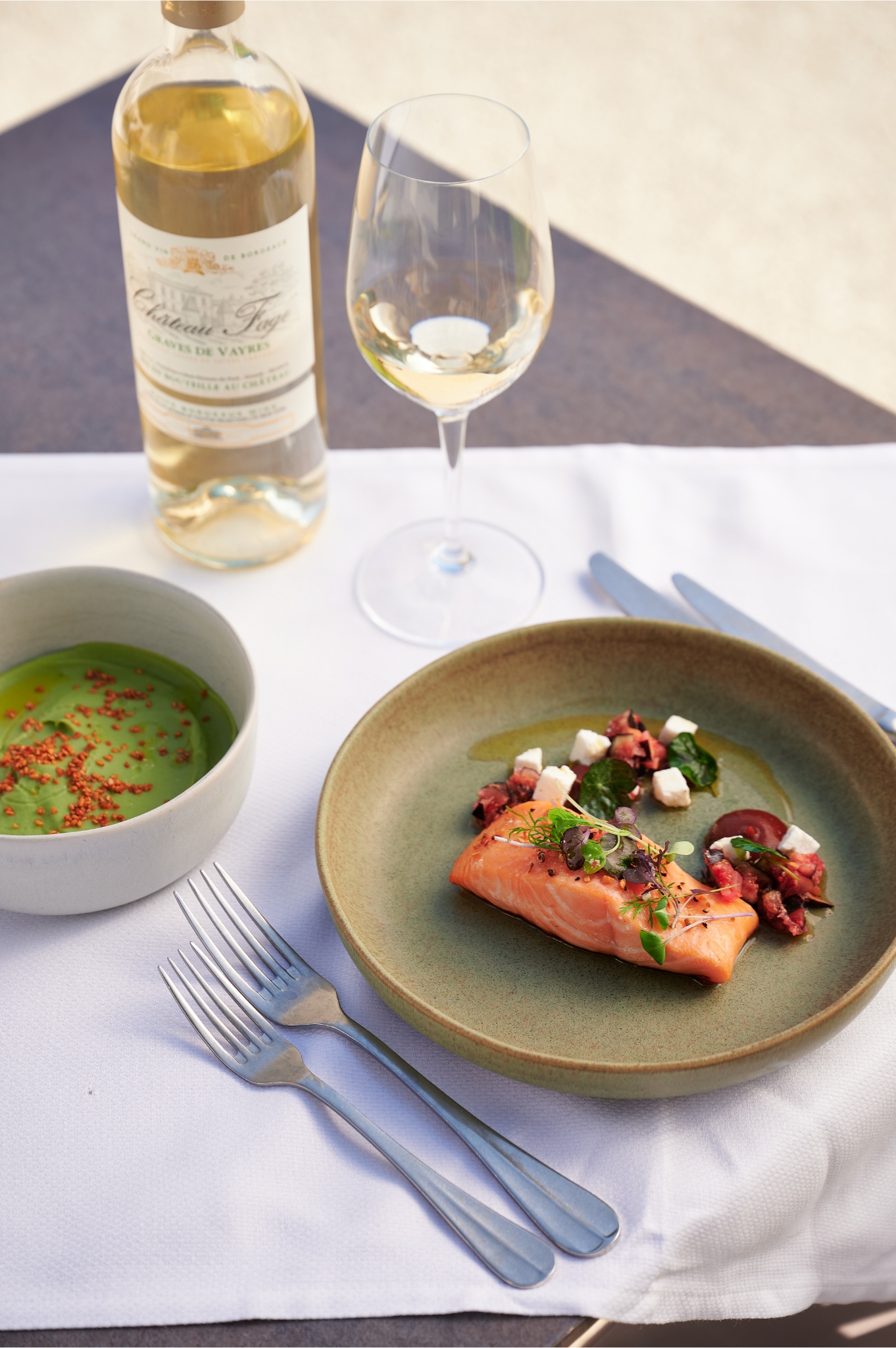 En la terraza, bajo la protección del emblemático roble de Fage o frente a la chimenea del gran salón, déjate tentar por un momento de gastronomía en perfecta armonía con el entorno natural y las viñas del Château.