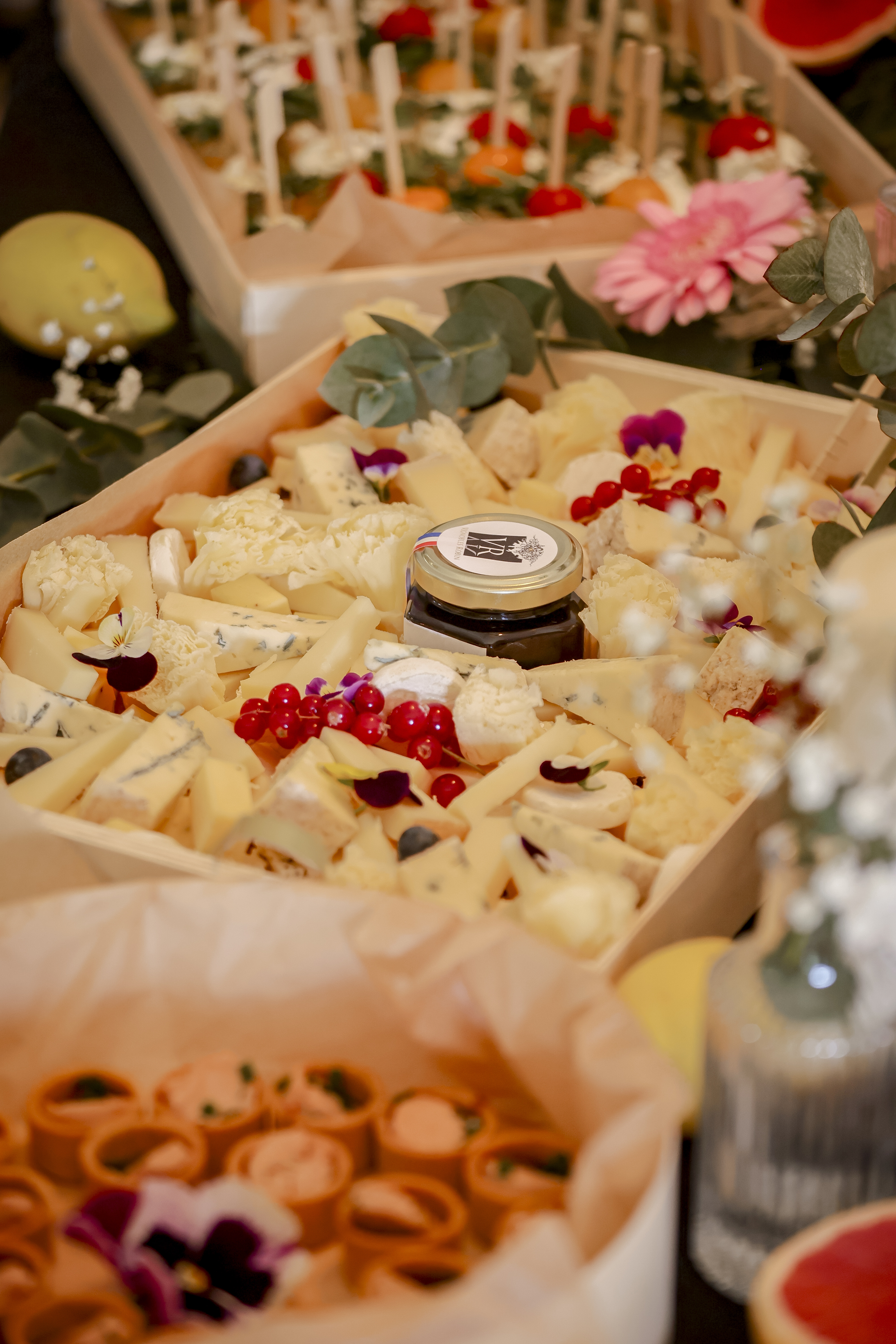 Menu à 39€ : 12 pièces sucrées et/ou salées, boissons froides et chaudes, 1 verre de vin de nos vignobles familiaux.