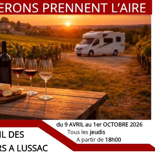 En collaboration avec la commune de Lussac, la Communauté de Communes du Grand Saint Emilionnais reconduit cette année l'événement "Les vignerons prennent l'Aire" sur l'aire de camping car Lussac ! Des vignerons volontaires animeront une soirée de dégustation de leurs crus afin de faire connaître leur domaine, leur travail et leurs créations. Cet événement se tiendra tous les jeudis soir, à partir de 18h00,entre avril et octobre 2026.
