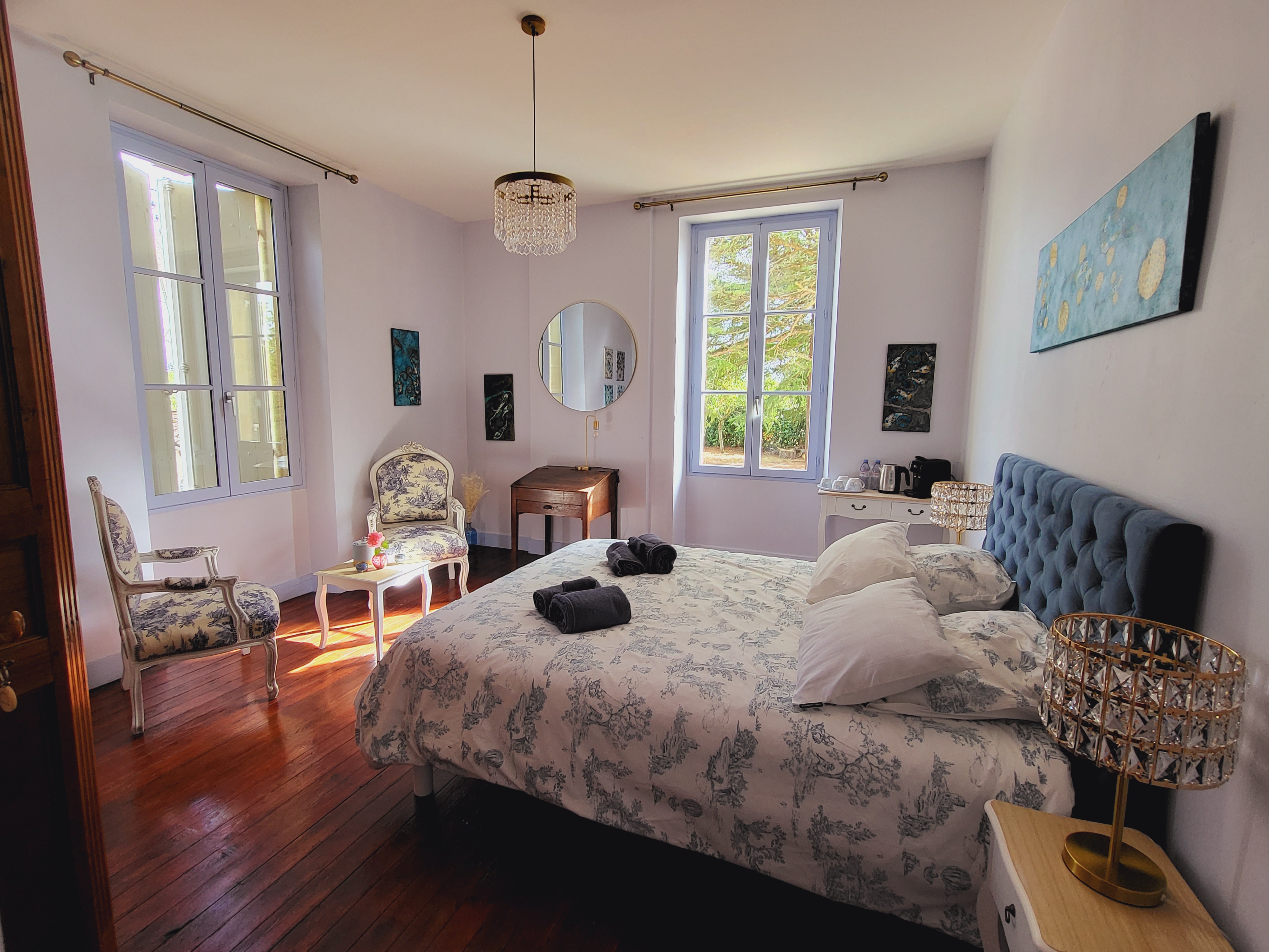 Situate al primo piano della casa, le due camere da letto a disposizione degli ospiti hanno ciascuna un letto king size (160x200 cm) con biancheria da letto di qualità alberghiera prodotta in Francia.e in Francia, un'area salotto con tavolino e 2 poltrone, una scrivania per il telelavoro (la fibra ottica è disponibile in casa), un vassoio di cortesia con bollitore e macchina da caffè "l'Or" e un deodorante per ambienti Dyson.