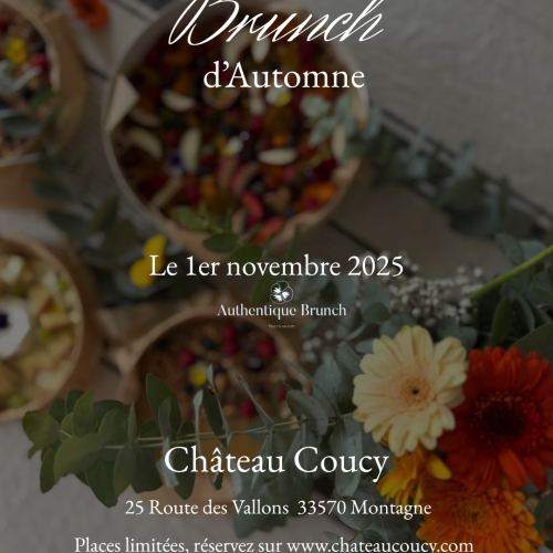 1er Novembre - Brunch d'Automne au Château Coucy 39,00 €Prix Brunch d'Automne + 2 verres de vin Lieu : Château Coucy à Montagne (33570) Date : 1er Novembre 2025 Horaires : 11h00 - 16h00 Entrée : 39 € par personne sur réservation UNIQUEMENT